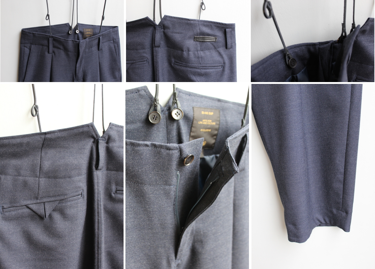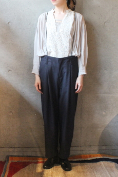 メンズスーツ地のような、 マニッシュな素材を使用した太めのパンツ。