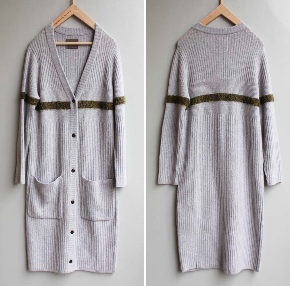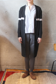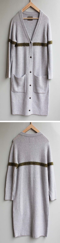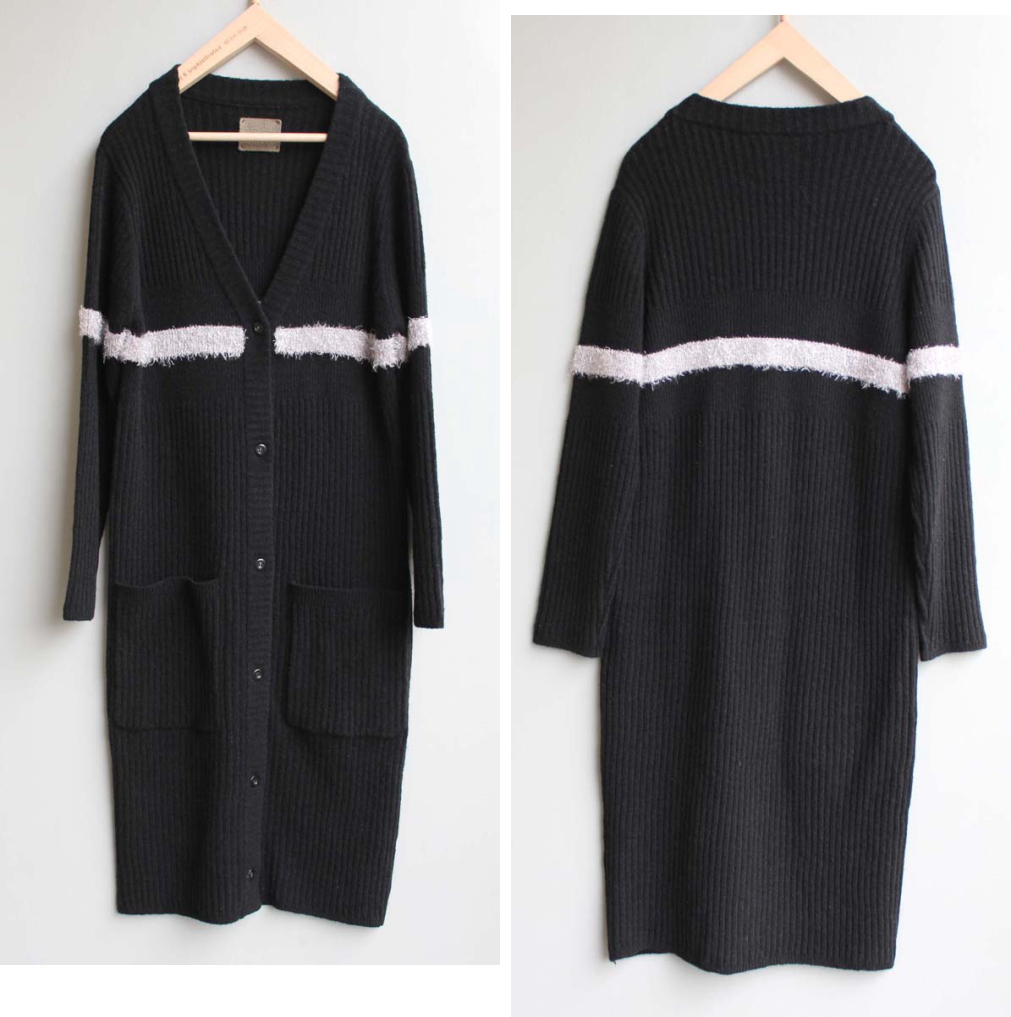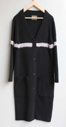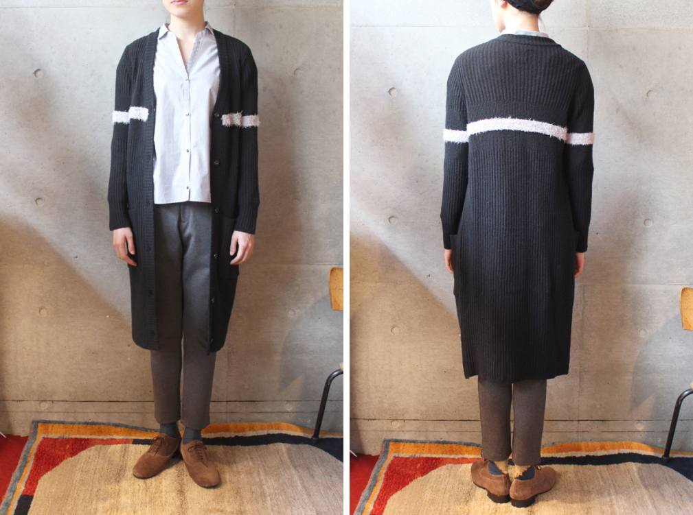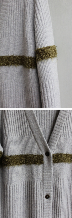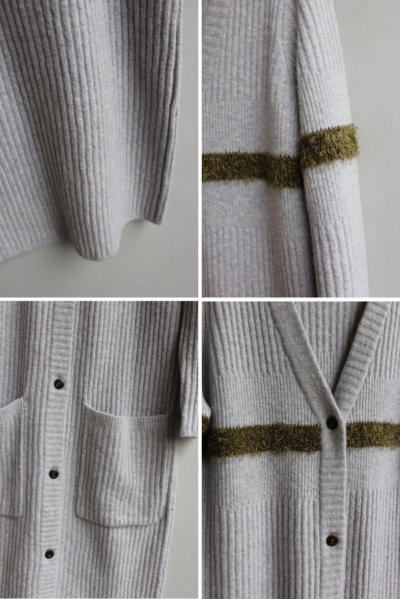 ふわふわとしたリブニットのロングカーデ。 ラインはもけもけとした切替になっており、 アクセントになります。