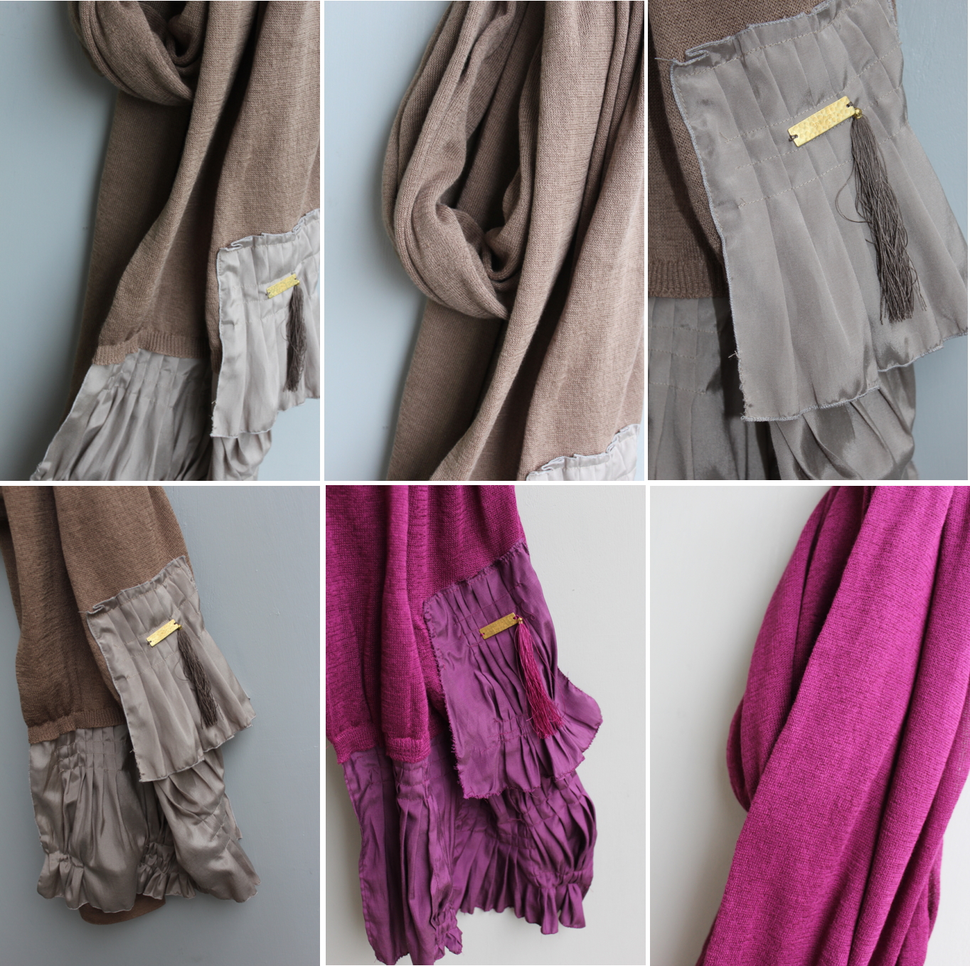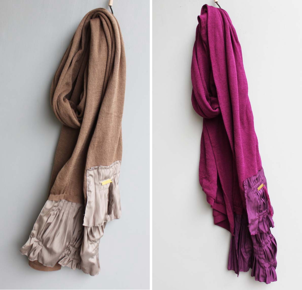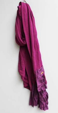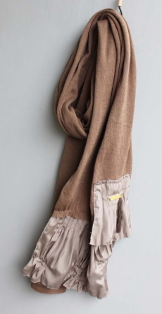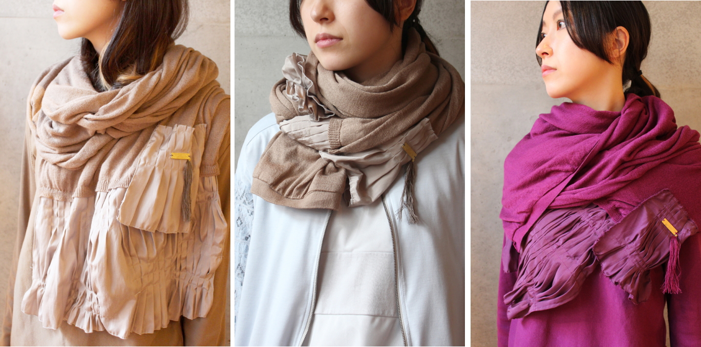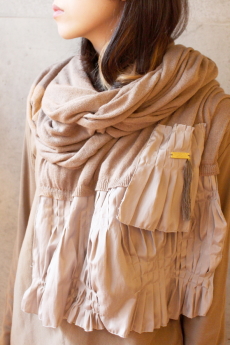 肌触りの気持ちいいニット素材のストール。 裾には異素材で作るプリーツがあしらわれ、 巻いたときのポイントになります。 タッセルやメタルプレートがアクセント♪