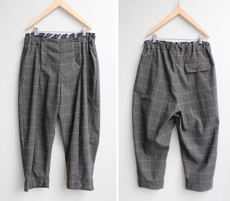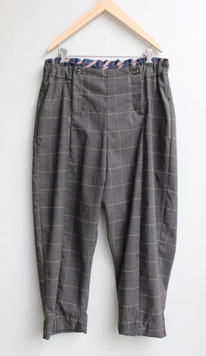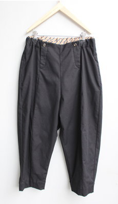 トラッドな素材感のゆったりラクチンパンツ♪ ウエストはボタンとパイピングの飾りがポイント。 裾は細身なので、いろいろなトップスと コーディネートしやすいです。