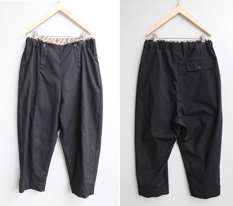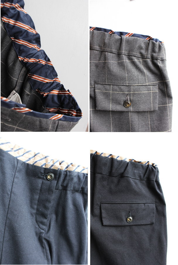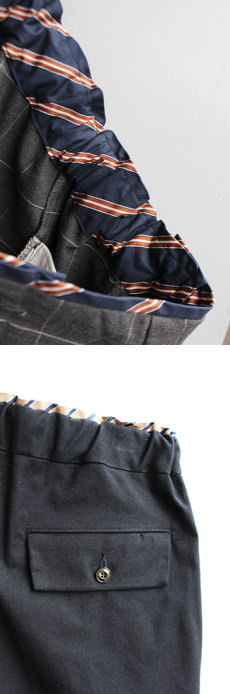 素材 チャコールグレー:ウィンドウペインT/Rストレッチ (ポリエステル64%・レーヨン34%・ポリウレタン2%) ブラック:ソフトウォームサージ (綿77%・レーヨン15%・ウール5%・ポリウレタン3%)