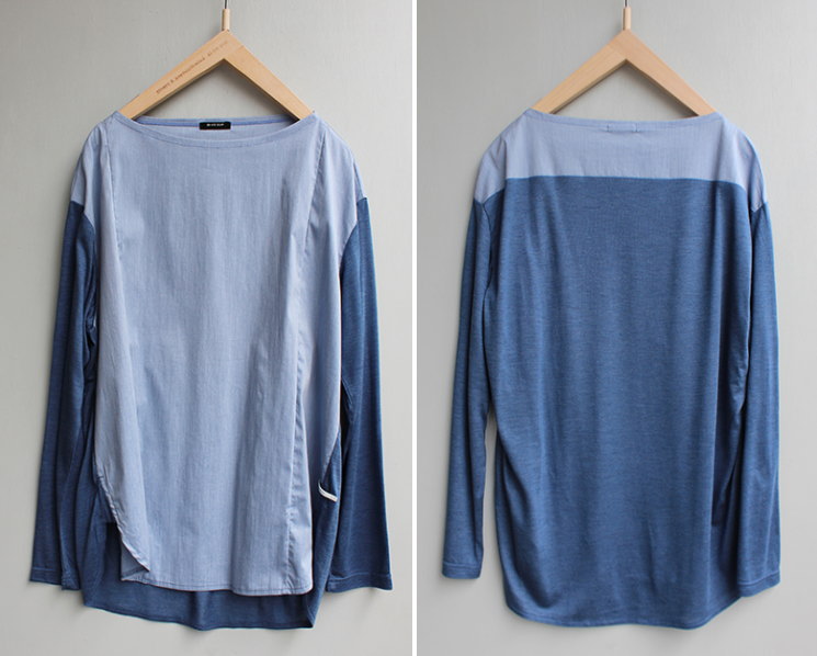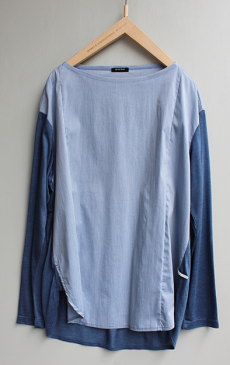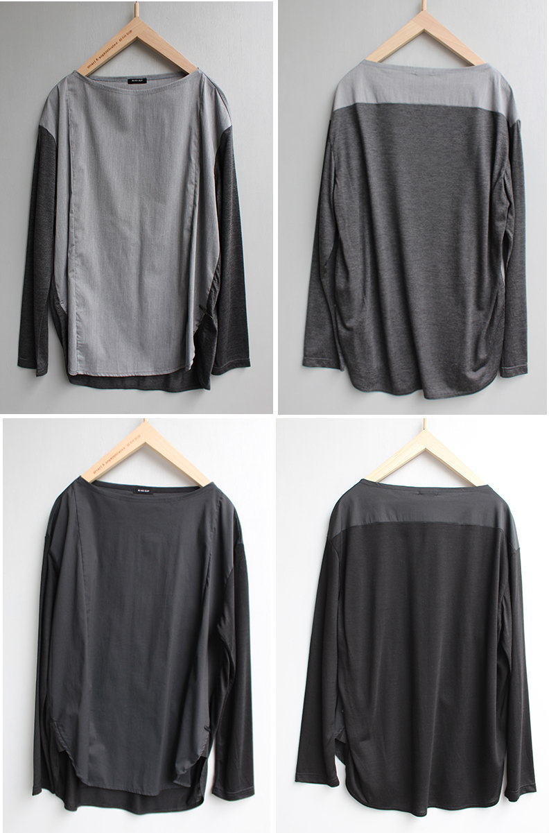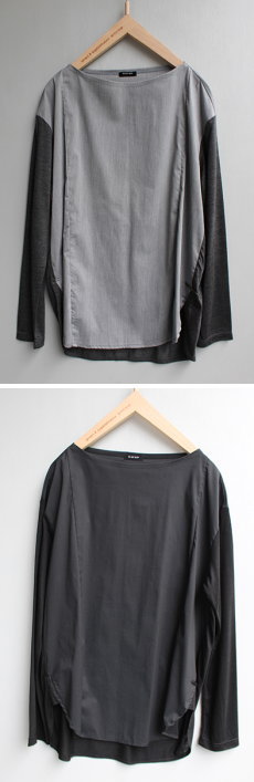 異素材使いのカットソー。 前は控えめな光沢感のある布帛、 後ろやお袖は薄手のとろんとしたジャージー素材を使用。