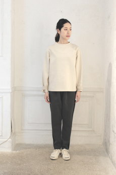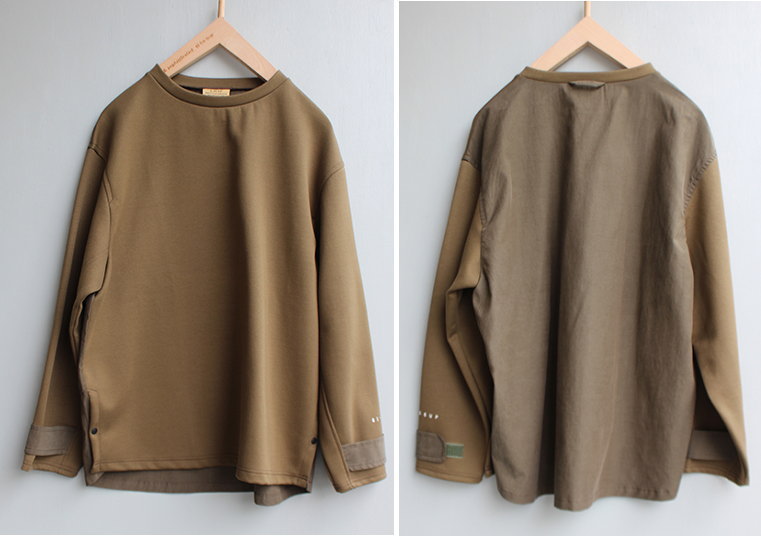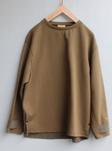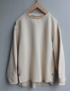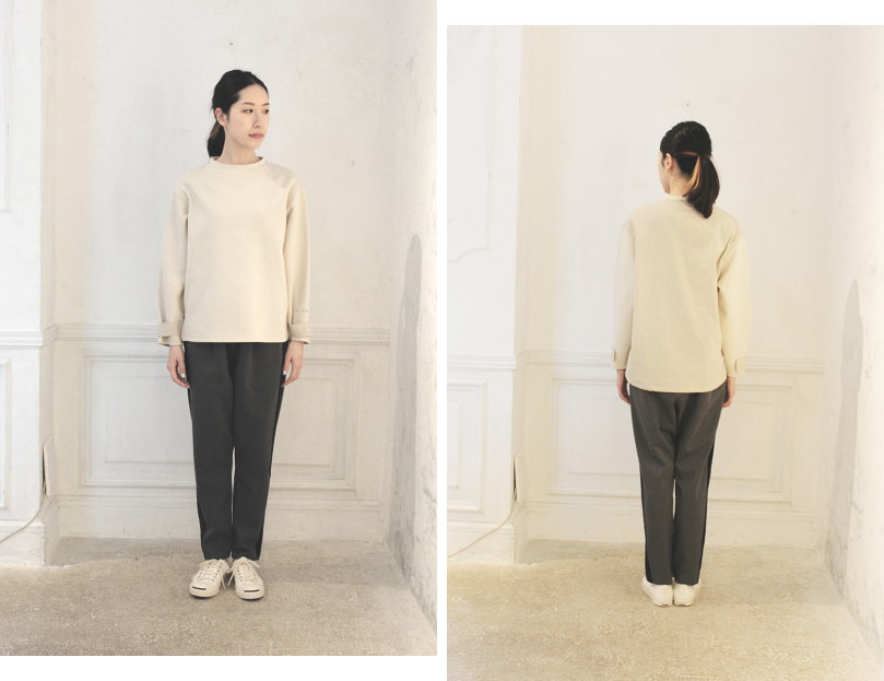 前後で異素材切り替えになったトップス。 ふくらみのあるダンボールニットと、 布帛素材を組み合わせています。