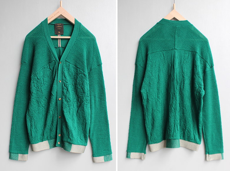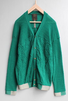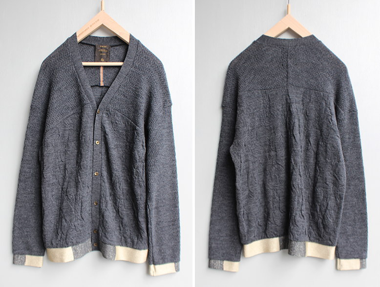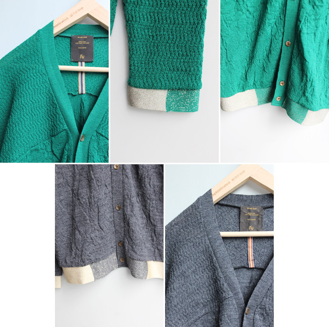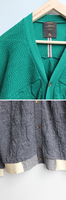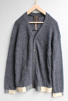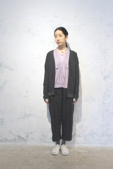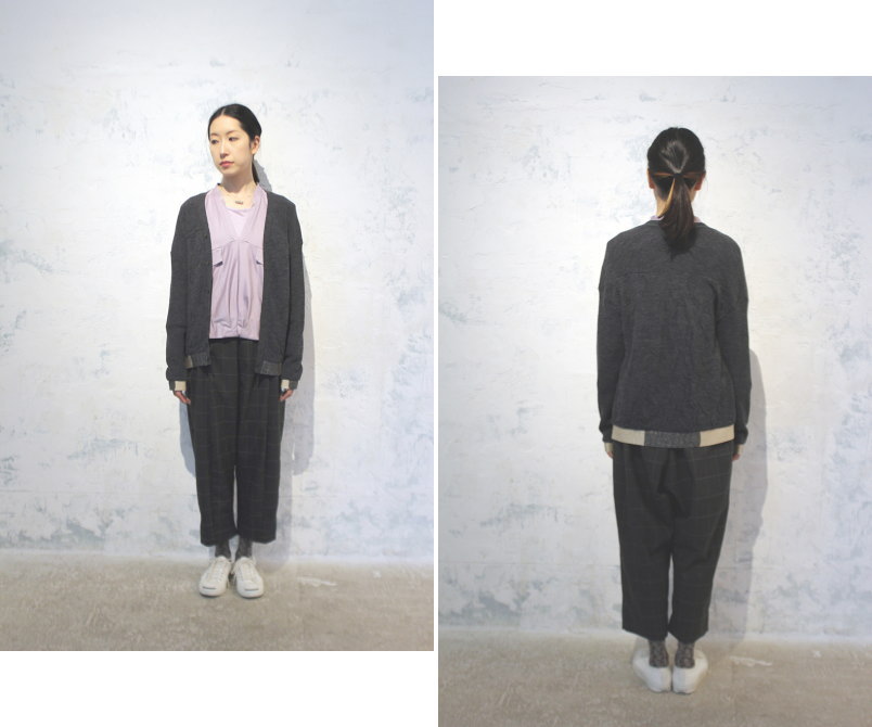 軽いウールジャガード素材のカーディガン。 さっと羽織れるので、室内の羽織にもよく、 コートの下に着ても◎ 袖口や裾のリブに入ったラメが目を引きます。