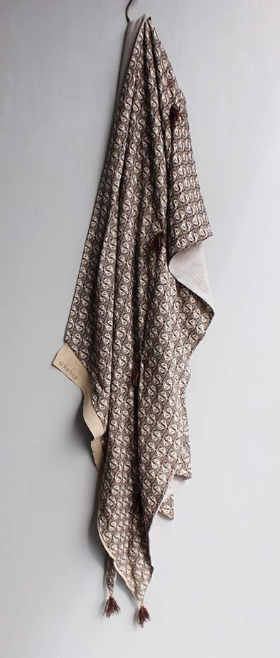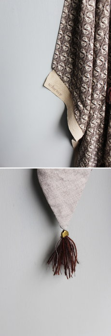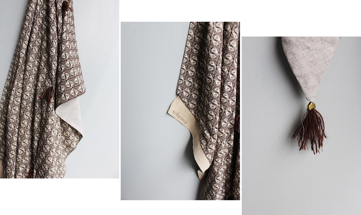 生地はSのイニシャルが連なったデザイン。 ところどころにはタッセルの装飾があり、 巻いたときにちらっと見えるのがポイント♪ 端のスエードレザーにはさりげなくロゴ入り。