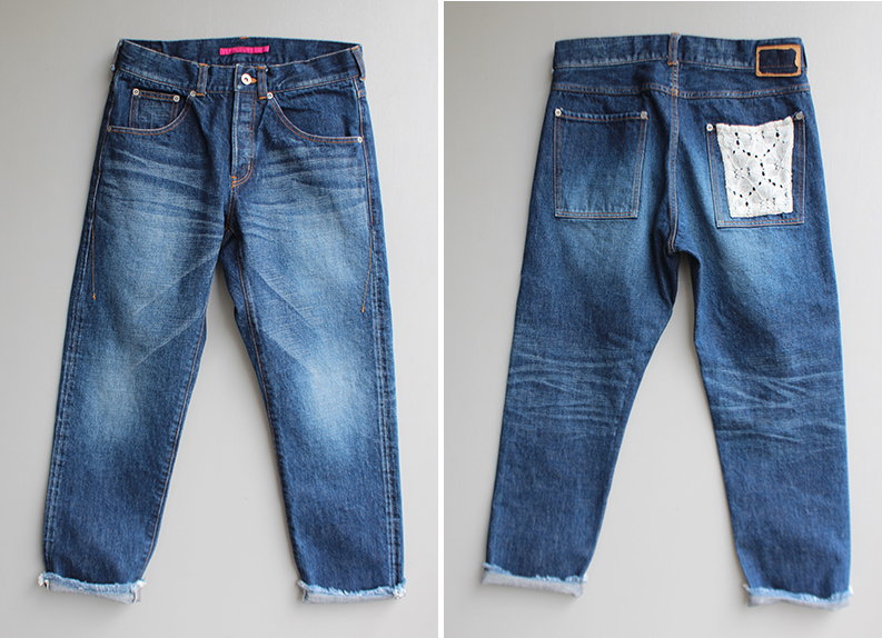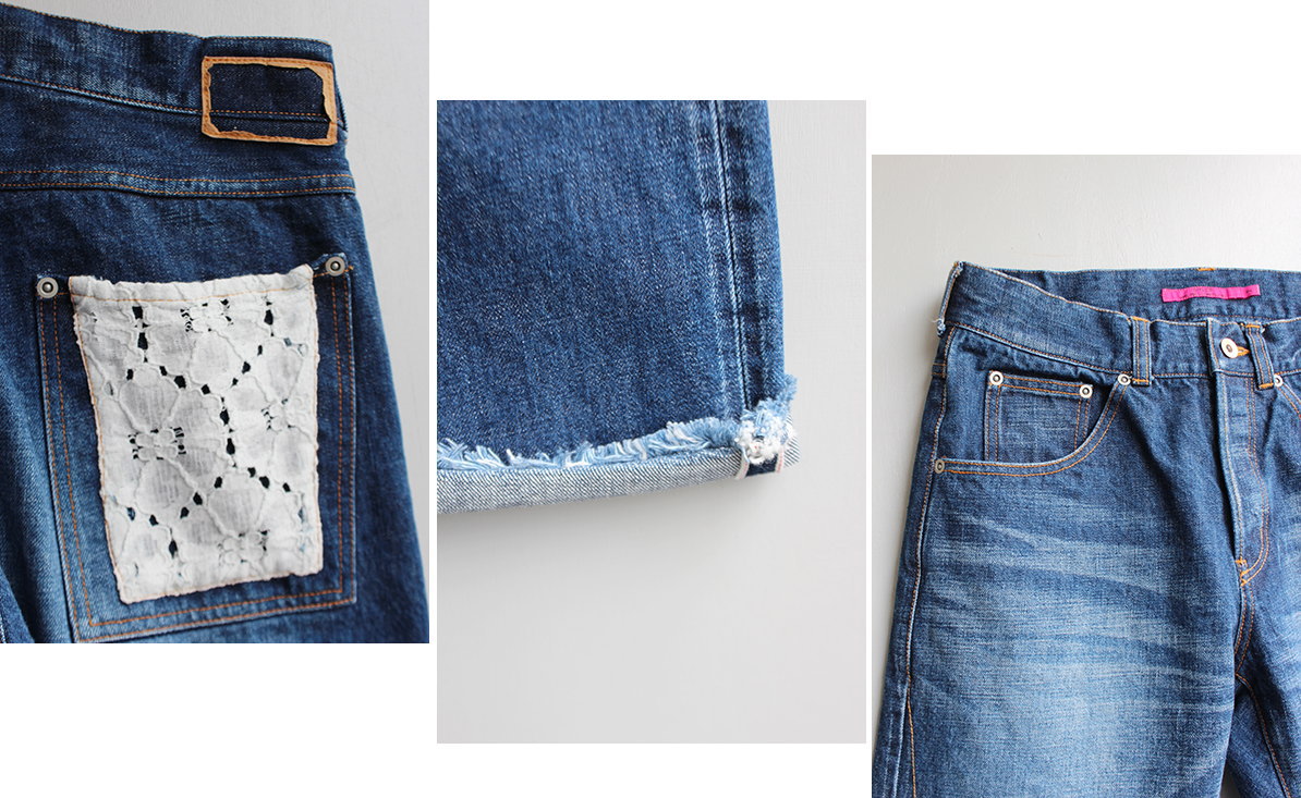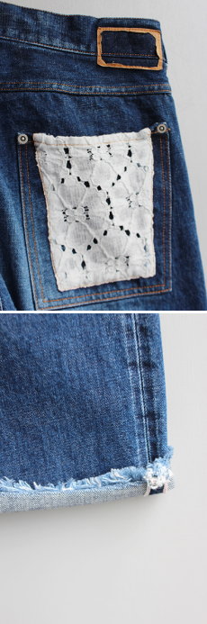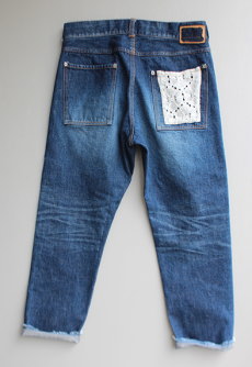 すっきりとしたほどよいストレートシルエットのデニム。 後ろポケットはレースになっており、 目を引く可愛いデザイン。 裾はフリンジ加工がされているので、 ロールアップをしなくても可愛いです。