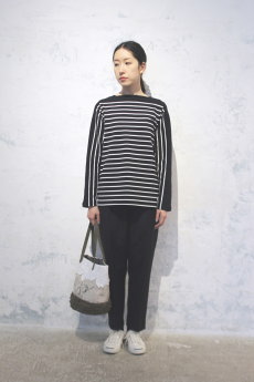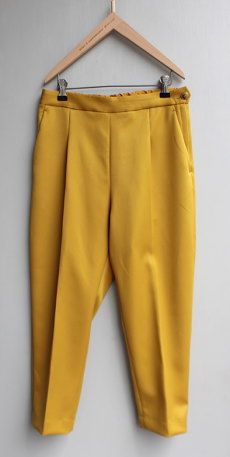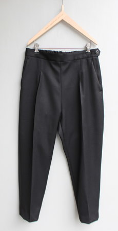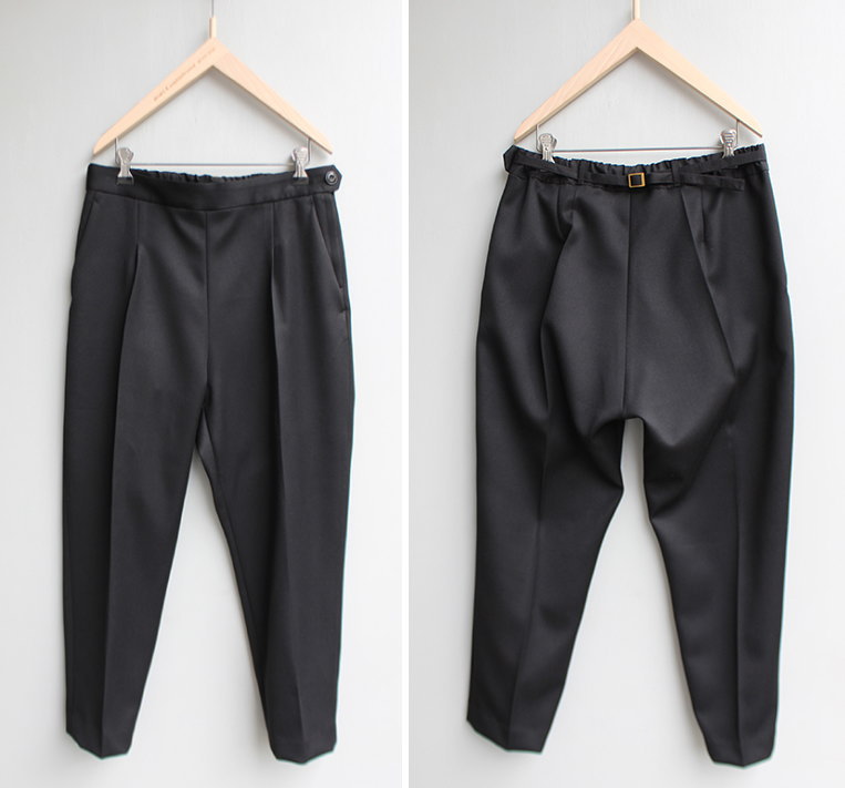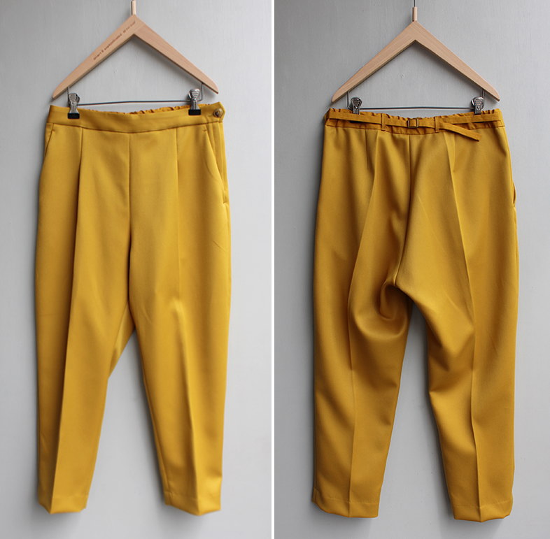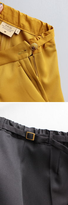 やや光沢感のある素材が上品なスラックスパンツ。 後ろウエストにベルトが付いたデザイン。 後ろウエストはゴムなので穿き心地ラクラク。